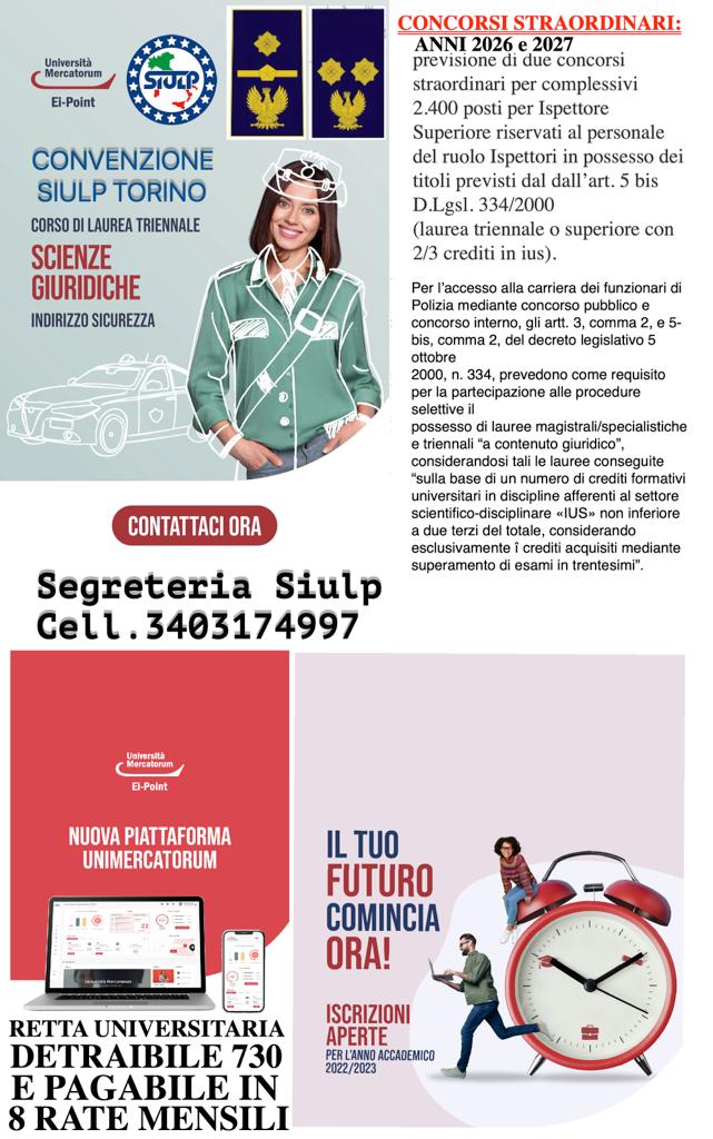 Siamo lieti di comunicarvi l’inizio di una nuova collaborazione con l'Università telematica Mercatorum. La convenzione estendibile ad amici e parenti del SIULP si propone di soddisfare le numerose richieste ricevute in questi mesi, i percorsi di Laurea proposti coniugano la possibilità di lavorare e studiare. La convezione propone ai nostri iscritti tutti i Corsi di Laurea, Master e Corsi di Alta Formazione: esempio CORSO DI LAUREA TRIENNALE IN SCIENZE GIURIDICHE DURATA: 3 ANNI CFU: 180 COSTO: € 1.500,00 (per ogni anno del Corso di Laurea da pagare in 8 rate da € 187,50)