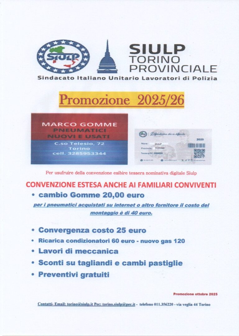 Si informano gli iscritti che è stata attivata una convenzione con il centro MARCO GOMME, corso Telesio 72/B – Torino.